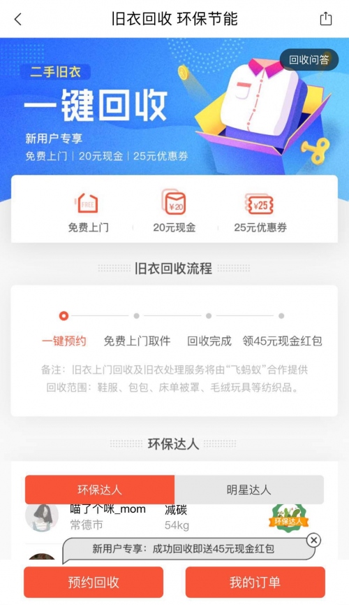 想要参与转转旧衣回收环保公益行动的用户,只需在转转的客户端上点击“一键回收”,填写回收信息, 当日即有快递上门免费回收揽收至站点,并更新物流状态,订单完成后用户会获得环保现金红包。不仅仅是旧衣服,鞋子、围巾、床单、被罩、毛绒玩具等都在转转旧衣回收的范围之内,为了均衡物流成本,转转鼓励用户尽量寄送大于5公斤重量的衣物。目前,转转在全国210个城市都已经开通了上门回收服务。