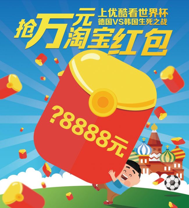 据统计,世界杯开赛12天来,优酷已经下118场红包雨,单日最高红包雨数高达14场。赛程过半,“进球就下红包雨”玩法再升级。在北京时间今晚“韩国-德国”的比赛中,单场红包雨总额将高达100万,更有单个高达万元的巨额大红包,可以直接用于淘宝购物。