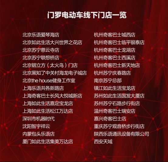 目前,门罗电动车线上渠道已经入驻京东商城、天猫、苏宁易购、国美在线等电商平台,线下渠道也覆盖了北京、上海、广州、浙江等地区的苏宁、如此生活、奇客巴士等三十余家门店。