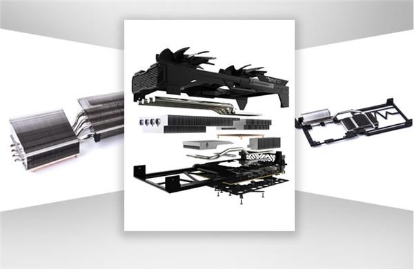 蓝宝石这次带给我们的另一大惊喜是在散热方面的极致表现。蓝宝石RX Vega 56 8G HBM2 白金版 OC采用大面积纯铜底座,散热主体使用了4根大尺寸的8mm热管,供电模组则用了1根6mm热管,非常给力。除此之外,为了配合机箱的垂直风道,这款显卡采用了比较短小的PCB,让热气可以直接穿过散热器从机箱上方排出。为了使显卡看起来更加浑然一体,蓝宝石RX Vega 56 8G HBM2 白金版 OC在极致散热的同时,将散热外壳、散热排、PCB及背板等散热原件进行了高度整合,整体性非常好。