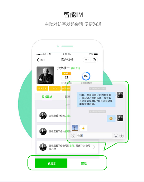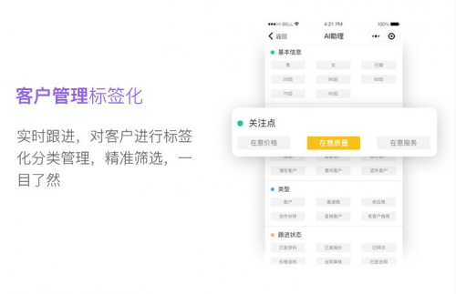 系统还拥有强大的数据挖掘和分析能力。用户的行为轨迹及频次、服务偏好、评价数据,这些信息都会被系统抓取、留存,并通过独特的人工智能算法,挖掘用户的关注点以及成交的概率,方便销售人员及时跟进和维护。