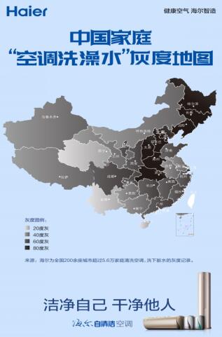 地图中用到的灰度色是指纯白、纯黑以及一系列从黑到白的过渡色。不同饱和度的黑色用灰度值来呈现,即从 0%(白色)到100%(黑色)的亮度值。海尔将全国空调洗出的脏水按区域灰度均值划分为80度灰、60度灰、40度灰和20度灰等4个灰度值。从地图上看,京津冀地区,脏水灰度平均值达到80度;鲁、川、浙、闽等地灰度平均值达到60度;藏、蒙等地灰度平均值达到40度;琼、青、滇等地灰度平均值为20度。