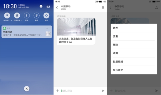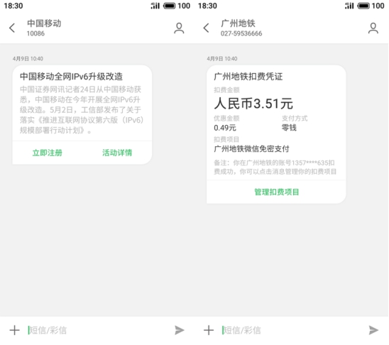 在全新的Flyme短信中,用户不仅可以像微信公众号一般阅读丰富多彩的图文内容,还可通过关联的服务进行快速查询和管理。