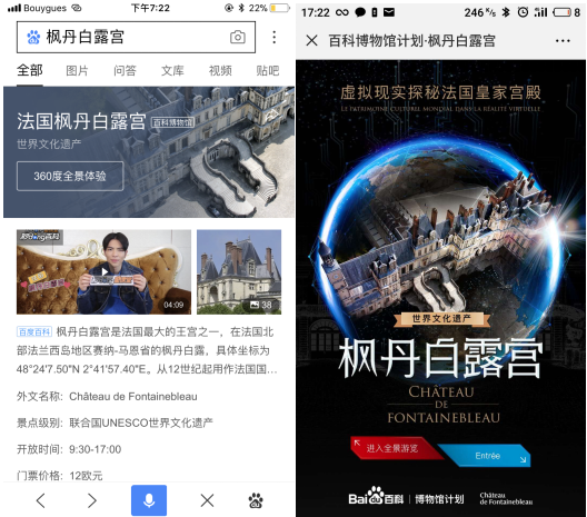 作为2018年重要的合作博物馆之一,枫丹白露宫是“百度百科博物馆计划”在法国地区上线的首家博物馆。枫丹白露宫是世界文化遗产,更是法国最大的王宫之一,美轮美奂的建筑风格和无数珍稀藏品,无不凸显了法国历史文化的魅力。百度百科运用技术手段,让全球用户感受这座知名的博物馆的独特魅力,打开在法国的合作之门。