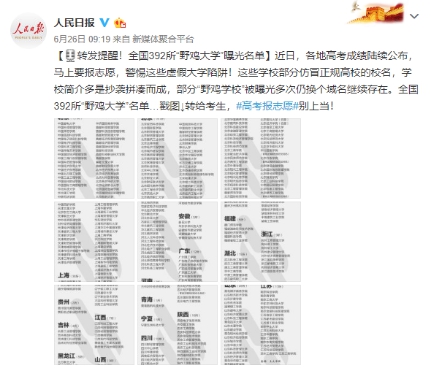 6月23日之后,各地高考成绩陆续公布,紧接着就是一年一度的志愿填报了。而每年的这个时候,各大媒体都要照惯例发布一份“野鸡大学名单”,而这份名单今年已经是第五批,总数已经增加到了392所。为了方便广大考生及家长进行志愿填报,前不久刷爆朋友圈的微信小程序“360防骗高手”也在近日上线了山寨高校查询功能。