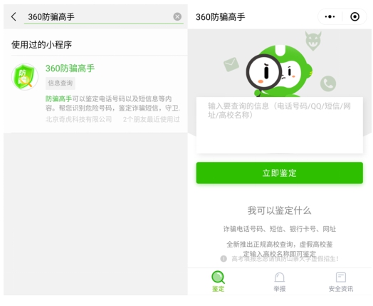360防骗高手小程序由360手机卫士团队开发,可识别多种目前常见的骗术,除了可以帮助大家鉴别山寨大学之外,360防骗高手小程序还可查询包括不明来电、中奖短信邮件中包含的电话号码及网址,还可帮助分辨虚假电视购物中的假冒伪劣商品,只需输入内容点击立即鉴定即可大大降低被骗的风险。