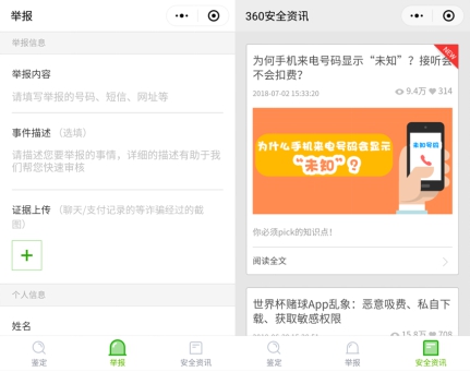 在360防骗高手小程序中,还包含有“举报”及“安全资讯”两个按钮,分别可为用户提供诈骗信息举报、最新的诈骗案件新闻和网络诈骗趋势预警等功能。同时,360安全专家也提醒广大网友,增强自身信息安全意识,及时了解最新的电信诈骗手段,从而降低被骗几率,避免遭受财产损失。