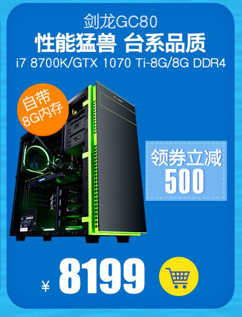 “性能猛兽”剑龙GC80领券到手价仅需8199,它搭载i7-8700K处理器以及GTX 1070Ti显卡,并于与华硕Z370 DRAGON主板强强联合,带来强悍的处理速度即使运行高特效的游戏画面也能轻松驾驭,主流电竞游戏任意畅玩,以出色的性能帮助玩家制胜四方!在这个分毫必争的时代,眨眼的瞬间都有可能对游戏结果产生直接影响,所以剑龙GC80硬盘方面采用闪战240 M.2,超高的读写性帮助玩家快速载入游戏,享受高速数据传输下带来的游戏快感。