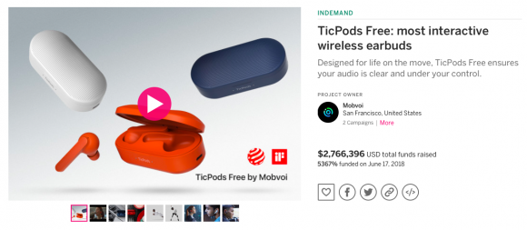 今年1月19日,出门问问推出了首款无线智能耳机产品,即小问智能耳机TicPods Free,并于4月18日登陆全球最大众筹平台之一的Indiegogo,正式面向全球销售。TicPods Free项目刚一上线便获得了众多支持者的青睐,众筹金额最终突破了270万美元大关,达到2,763,116美元。