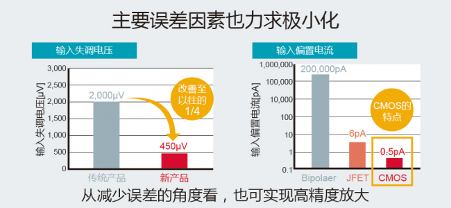 新产品的输入失调电压仅为450µV(传统产品的1/4),输入偏置电流仅为0.5pA(传统产品的1/2),从减少误差的角度看也可实现高精度放大。