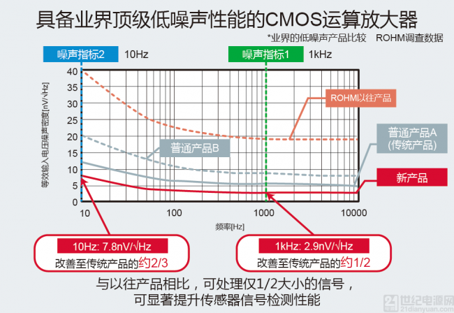 ROHM通过发挥模拟设计技术和独有的工艺等垂直统合型生产体制优势,去年面向车载市场开发出超强抗噪声(抗外部噪声性能优异)运算放大器,此次则面向工业设备及家电等领域开发出业界顶级的低噪声(电子电路产生的噪声少)运算放大器。