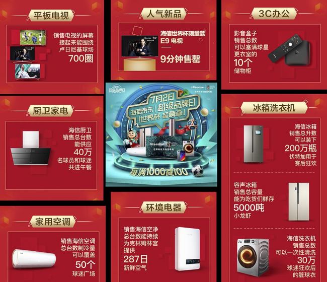 在刚刚过去的7月2日京东超级品牌日,主打的看球神器E9世界杯限量款电视9分钟即告售罄!海信销售的平板电视接起来能围绕世界杯决赛场地卢日基尼体育场足足700圈!销售的海信空调总制冷量可以覆盖50个球迷广场,销售的海信冰箱总升数可以装下200万瓶伏特加用于赛后狂欢,销售的容声冰箱总容量则能装下5000吨小龙虾……618之后还能有如此爆发力,固然与世界杯效应密不可分,京东平台的赋能显然也不容忽视。