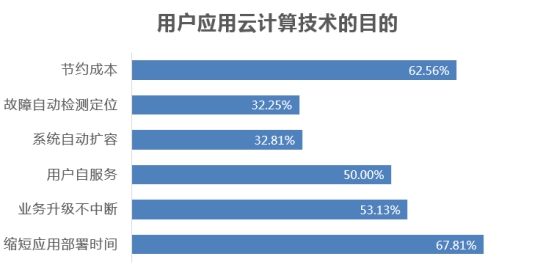 在中国通信院对已经使用和有计划使用云计算技术的企业调查中,67.81% 的公司认为缩短应用部署时间是应用云计算最重要目的,62.56% 的公司认为节约成本是应用云计算技术最重要目的。