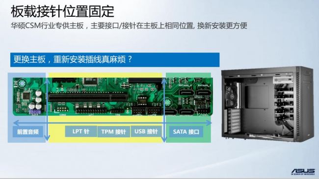 在安装方面,华硕行业专供CSM主板也非常人性化,接针保护盒及板载接针位置固定使安装简易,维护令安装更简易,更便于教育客户维护。此外,华硕行业专供CSM主板还拥有丰富的接口,能够满足前台、财务、制造机床的需求,令企业不需要额外采购型号。