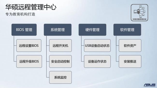 易管理也是华硕远程管理中心软件(ACC-ASUS Control Center)的突出优势,可对企业内部电脑的BIOS、系统、硬件、软件等方面进行统一高效的管理。其中,它的BIOS管理非常的方便,包括远程设置BIOS以及远程升级BIOS,并且所有华硕行业专供CSM主板均支持定制专属的BIOS,例如企业专属开机LOGO画面、专属客制化固件信息等。它的系统管理包括了远程开关机、安全启动控制、系统监控。硬件管理包括了USB设备启动状态管理、设备运行状态管理。软件管理包括了软件资产管理以及安装推送管理。