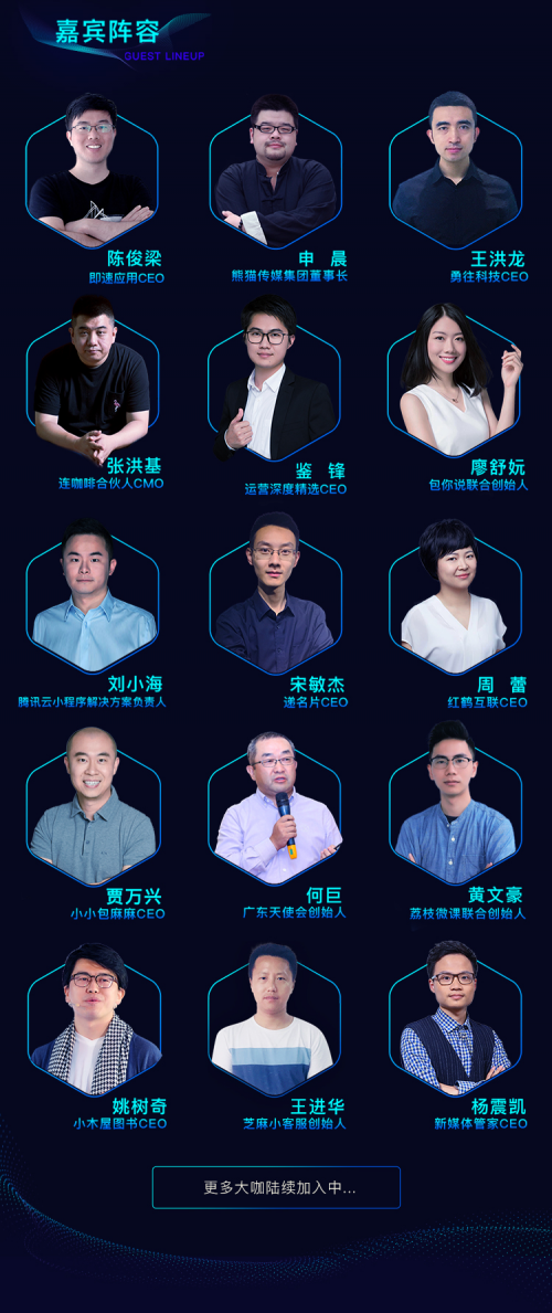 我们为你邀请到了25位小程序领域的大咖,包括递名片CEO-宋敏杰、勇往科技(画画猜猜)CEO-王洪龙、连咖啡合伙人CMO-张洪基、小小包麻麻CEO-贾万兴、包你说联合创始人-廖舒妧、腾讯云小程序解决方案负责人-刘小海....,为你带来行业内最新小程序玩法。