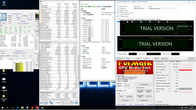 在单烤FPU的基础上再对机器进行Furmark烤机测试,也就是双烤测试:可以看到,双烤后PL1功耗回落到了45W,满载双烤12分钟,CPU的温度稳定在79°,功耗45W,频率3.1GHz。显卡的温度稳定在70°,功耗75W,频率稳定在1.2GHz,均表现正常。