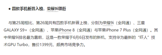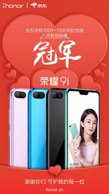 京东手机通讯官微发布的《京东手机6月销量风云榜》榜单显示,荣耀手机荣膺京东手机6月份手机销量冠军、安卓手机销售额冠军。荣耀9i作为荣耀在6月6日发布的“千元潮美旗舰”,自然也不负众望,勇夺京东手机1000-1500元价位段六月新品销量冠军。
