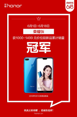 此前,荣耀9i在6月7日首销第一天,就成为了6月7日京东和天猫平台的手机单品销量双冠军;而在京东618活动期间,荣耀9i更是1000到1499元价位段新品累计销量冠军;从荣耀9i热卖的形势来看,夺得这次京东手机1000-1500价位段六月新品销量冠军也合情合理。