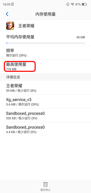 除了多后台的挂载而外,大内存在其他应用场景同样有用武之力。我们还是以游戏作为参考对象,这次更换为同样热门的王者荣耀,776MB的RAM占用虽然标注为最高,但为了满足内存的强动态需求,这只能算是一个标准要求。
