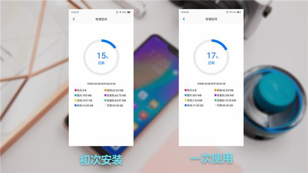 图中分别是刚安装之后的存储占用和每个APP点开使用一次之后的情况(仅进入主界面,不做任何操作,如有需要登录账号同步数据的应用,出现登录界面就退出)。可以看到,当应用的数量增加之后,即使只是简单一次使用,内存也被吃掉了128*2%=2.56GB的空间。在拥有128GB存储的海信H20之上这个增量属于毫无压力,空间还很富余,但是如果放到普通小内存手机上,这时使用就已经需要悠着点了。
