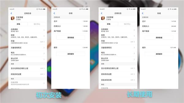 即使是同一款应用,初次安装时的占用大小也只是一个基础要求:刚安装时王者荣耀程序本身大小1.08GB,用户数据才1.15MB。而在使用过程中存储空间用量越来越大,右侧的截图里,用户数据量达到了1.21GB,总占用空间相比之前翻了一番还有余,这就对手机的存储容量提出了更高的要求。