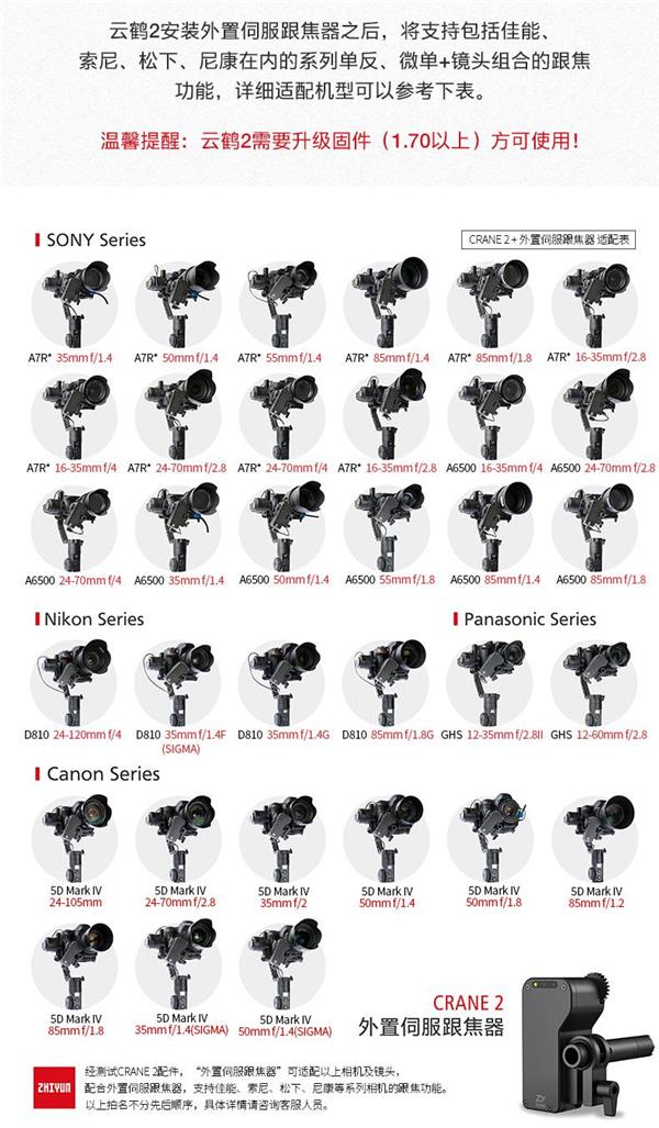 云鹤2可以直接控制佳能相机的快门、录制、还可以用跟焦滚轮实现对佳能相机的跟焦控制,仅仅只需要一根包装内标配的数据线,非常简单;另外云鹤2还支持对索尼主流相机的快门和录制控制,部分可实现变焦,只需使用标配的连接线就行;其余跟焦功能可以通过标配的外置伺服跟焦器实现、另外松下相机也支持快门和录制、尼康则对D850做了专门适配,完美实现跟焦和调整参数,兼容性方面适用于主流的所有相机、对于跟焦功能的拓展,则同样借助附送的跟外置伺服焦器可实现机械跟焦和变焦功能,外置伺服跟焦器的适用尺寸范围也非常广,收集的列表如下: