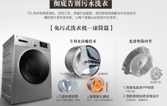 传统洗衣机在长期使用后,内部会累积污垢,滋生大量有害病菌,不仅在洗衣过程中二次污染衣物,还会造成衣物之间的交叉污染,而且到了夏季,温度和湿度更加适宜病菌滋生,从而威胁到你的健康!而TCL免污式洗衣机的出现则彻底解决了这个问题,TCL免污式滚筒洗衣机采用创新水封舱免污结构,彻底将内筒底三脚架密封,三重水封设计内筒底平面光滑,防止污垢残留,完全隔离污染物真正做到100%全免污,即全方位免污、全过程免污和全寿命免污。