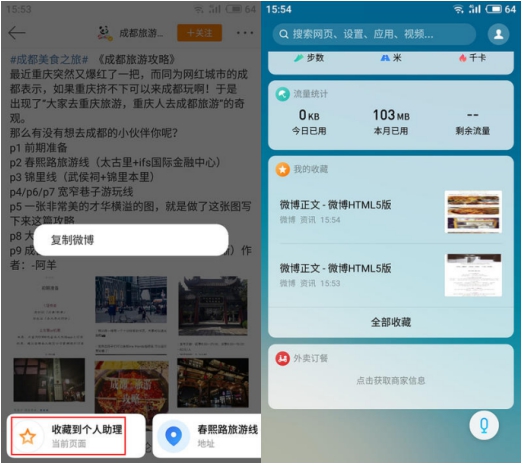 智能识屏提供了一键收藏功能,当大家找到满意的攻略时只需长按屏幕即可呼出该功能,在弹出的卡片中点击“收藏到个人助理”即可。在游玩中如有不了解或遗忘地方,随时随地打开手机即可查看收藏的攻略,让你的旅途更加从容。对于不熟悉的景点,你还可以通过智能识屏提供的“文本选择”功能,方便地对景点信息进行搜索和查看。