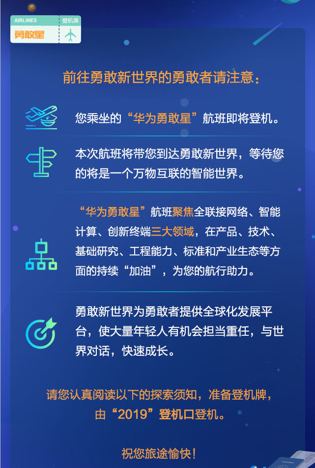 据悉,华为针对2019年应届生招聘的口号是“勇敢新世界”,意在表达为殷殷学子们提供全球化发展的崭新平台,并搭建与世界尖端技术、国际化标准建立连接的高度与机会,让大家通过“以奋斗者为本”和自己不懈的努力,扛起重任并快速成长,收获合理回报的同时得到实现自身价值最大化的最佳通道。