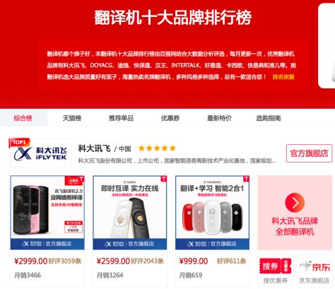 最近,最新人工智能翻译机排行榜公布,由国家级科技创新企业科大讯飞出品的讯飞翻译机2.0则稳坐该榜单综合榜TOP1。目前其在发布仅2个月,在京东的评价数就达到1.1万+,远高于其他品牌产品。并在最近,因为“国礼”事件再度刷屏。