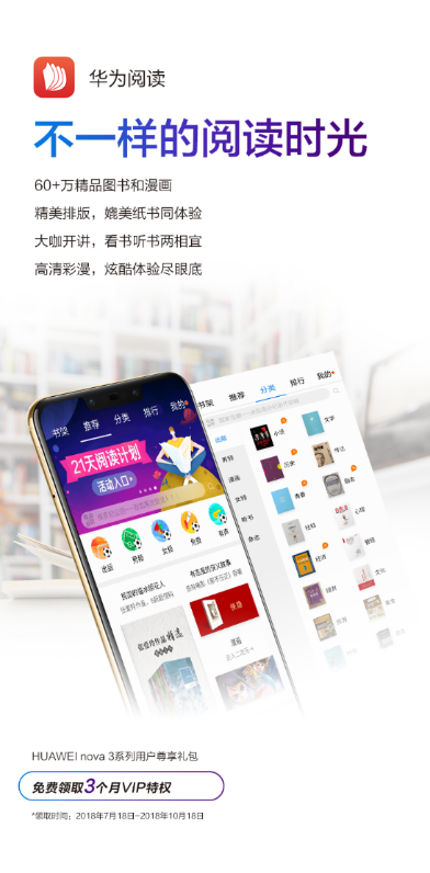 闲暇时刻,nova星人还可以通过华为阅读来获得更多的手机阅读体验,遇见更好的自己。华为阅读支持60+万册精品图书和高清全彩漫画,并采用自然色彩技术,媲美纸质书的排版细节,呵护双眼观感更舒适。而内置的听书模式、大咖开讲等也可以让你充分利用起碎片化时间,让阅读更加不一样。HUAWEI nova 3用户同时可在华为阅读中免费领取3个月VIP特权,让阅读更过瘾。