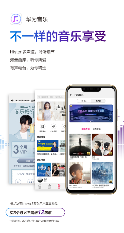 nova星人绝对不能没有BGM,温暖治愈,idol首发,动感激情……每一首音乐都值得被聆听,透过华为音乐Histen音效,为你还原最真实自然的声音。同时,华为音乐为热爱跑步的nova星人提供“跑步音乐”功能,可以自动感应你步频的快慢,并为之匹配不同节奏的歌曲播放,跑出专属你的BGM,为生活的每一刻伴奏!nova 3机型用户购买3个月VIP即可领取12花币,超值权益礼包你值得拥有!