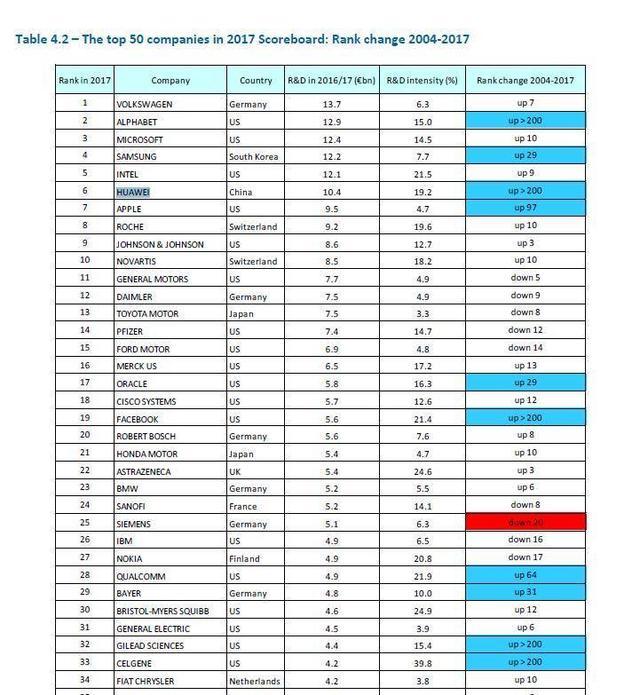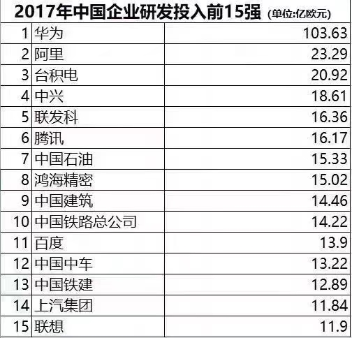 早在不久前,欧盟委员会发布的“2017全球企业研发投入排行榜”统计了全球一共2500家企业投入研发,其中包括481家中国企业。榜单中的中国企业有10家进入了全球研发投入100强,华为在中国企业中排名最高,年度研发投入为104亿欧元,位列全球第六,中国研发投入第一,已遥遥领先于其他企业。