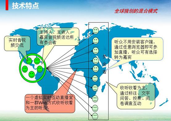 263企业直播的技术架构基于全球独创的混合模式,既包含了视频会议技术,也包含一个基于网页的流媒体分布式直播系统,并在网络适应性上做了五大优化。
