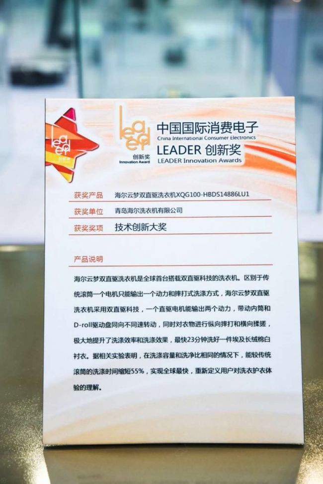 中国国际消费电子Leader创新奖作为国内消费电子领域的权威奖项,涵盖面广,针对性强,专业化水平高,代表年度消费电子新品的最高研发水准和最新技术走向。海尔云梦双直驱洗衣机获本届leader技术创新奖,彰显出其在洗护行业的领先实力。