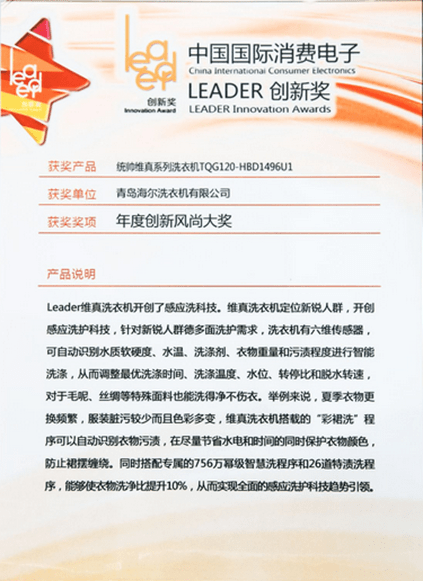 7月20日,2018中国国际消费电子博览会(简称电博会)在青岛国际会展中心举行。会上,备受关注的Leader创新奖评选结果也在2018电博会上同步揭晓。其中,统帅维真洗衣机摘得Leader创新奖“年度创新风尚奖”。