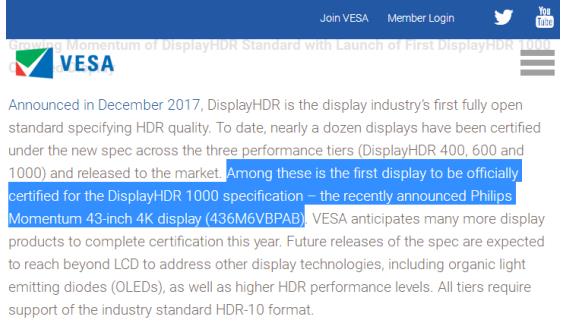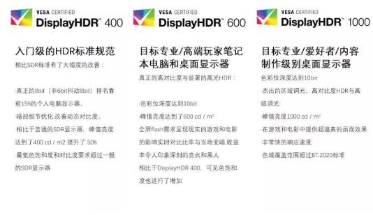 在电视机将HDR技术炒得火热的时期,国际上还没有一套完整、严格的HDR电视的标准,许多品牌的电视机宣称自己拥有HDR技术,却通常是在算法上对HDR片源进行支持。而由VESA推出的DisplayHDR400、DisplayHDR600、DisplayHDR1000,统一了HDR标准的划分,分别从色深、亮度、对比度和饱和度等方面对各个标准的显示器进行了定义。