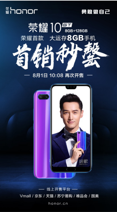 7月24日10:08,荣耀首款大运存8GB手机荣耀10GT在线上全平台正式开售便极速售罄,再次印证了其在市场上的火爆态势。在下周三(8月1日)10:08,荣耀10GT 8+128GB将迎来第二轮开售。