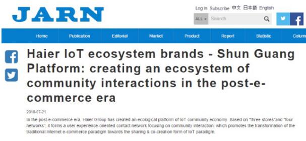 7月21日,日本《JARN》杂志转载刊发了以《海尔物联网生态系统品牌——顺逛平台:在后电子商务时代创建社群交互生态系统》为题的新闻,介绍了顺逛基于“三店四网”形成的以用户体验为导向的社群交互体系,认为顺逛促进了传统互联网电子商务范式向物联网范式共享共创的转变,已成为物联网社群经济的生态平台。