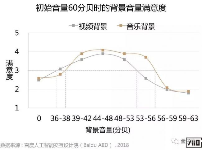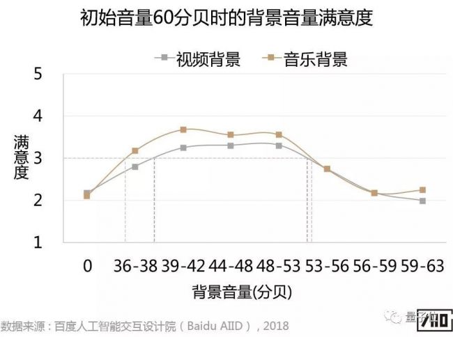 实验结果发现,无论背景是视频还是音乐,用户都不喜欢背景完全静音(注:下图中”0”代表背景完全静音)。针对有屏音箱和智能电视,当初始音量约为60分贝时,背景音量舒适范围略有差异,具体结果如下: