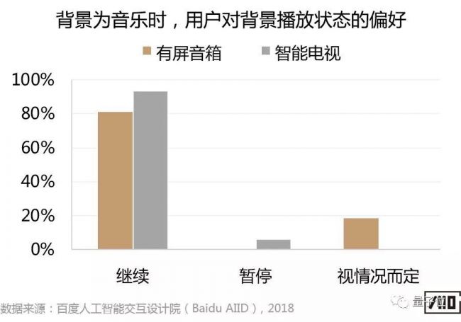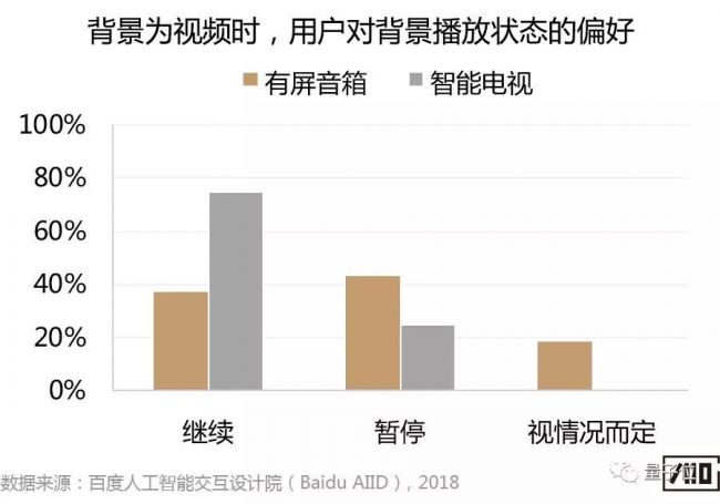 此外,结合实验后的问卷调研结果发现,关于背景的播放状态,背景为音乐时用户更倾向继续播放,而背景为视频时有屏音箱端倾向视频暂停的用户更多。主要是由于有屏音箱端背景视频被完全覆盖,因此,用户认为背景视频暂停较好,以避免错过感兴趣的视频内容。