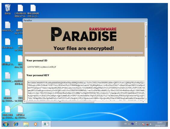 一个“魔鬼撒旦”已经让许多用户头疼不已,结果一波未平一波又起。最近,360安全中心又监测到一款名为“Paradise(天堂)”的勒索病毒,该勒索病毒运行后将会加密所有找到的文件,但不会加密系统以及部分浏览器文件夹下的文件。在加密完成文件后,还会添加一个超长后缀(_V.0.0.0.1{yourencrypter@protonmail.ch}.dp)至原文件名末尾,并且在每个包含加密文件的文件夹中都会生成一份“勒索声明”,声明中附上了自己的邮箱,还有一个自动生成的用户ID,以此来作为用户要求解密的凭证。