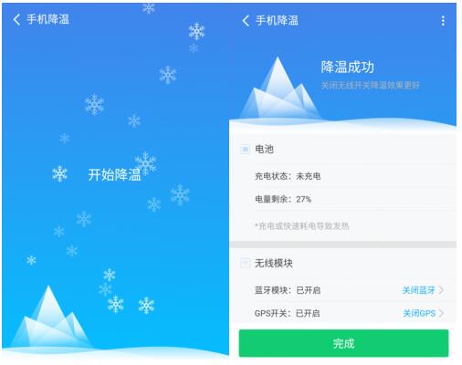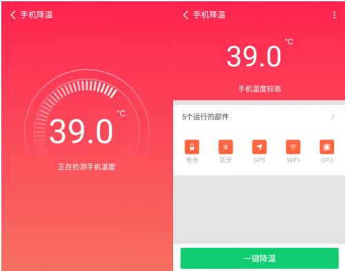 点击360手机卫士的“手机降温”功能后,软件首先会检测当前的手机温度,随后给出导致当前手机温度过高的部件,点击底部的一键降温按钮后,软件会自动完成清理前、后台程序、调整系统载荷等一系列操作,同时用户还可以在降温后的界面上手动关闭蓝牙、GPS、WiFi等硬件功能,进一步加速手机降温。