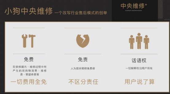 技术创新让小狗电器掌握了核心技术,而服务创新则收获了消费者的一致好评,小狗电器针对传统“外包”服务的“维修周期长、责任扯皮、收费混乱、维修不规范、多次返修的传统网点式小家电售后现状。在2014年率先推出了“中央维修”服务模式小狗电器中央维修服务是以中央仓库为中心,以第三方快递为网络,实现待修产品从用户到中央维修中心送修、再二次快递至用户的售后服务流程。而且在服务过程中小狗电器承诺保修期内一切产品问题均可保修,不用区分责任。用户的产品保修过程产生的所有费用,都将由小狗电器售后服务承担,且解释权归用户所有。