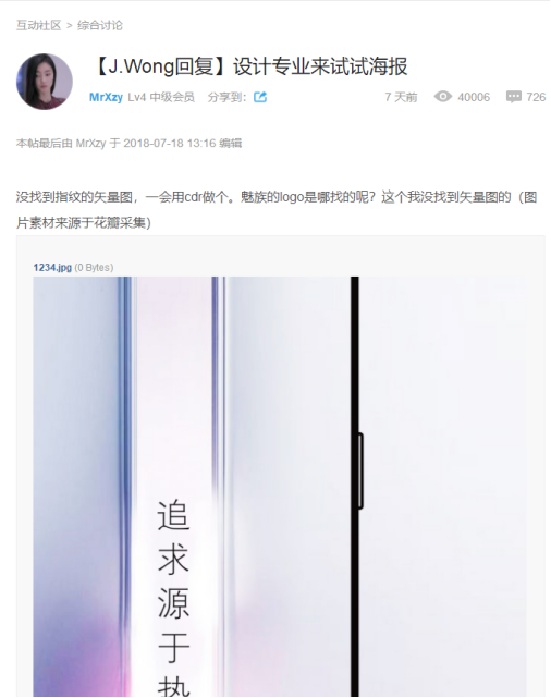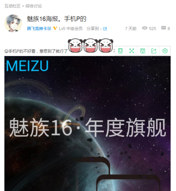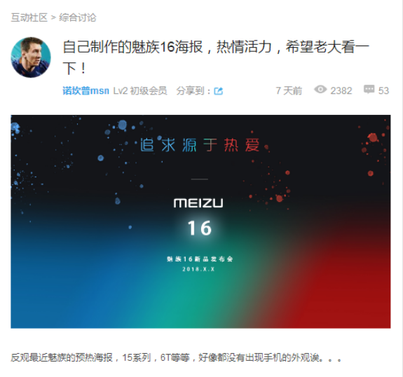 魅族论坛里面个个都是P图能手,不仅考虑到宣传场合的需求,设计出横版、竖版两款海报,而且为了表达对魅族16年度旗舰的热爱,心急地拿出手机先P为敬。