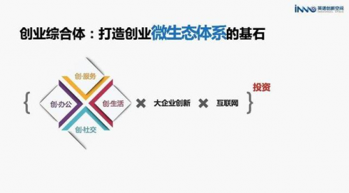以上两类服务加上大企业创新的需求,以互联网为技术基础,以投资为驱动力,就形成了创业综合体这样一个微生态环境。