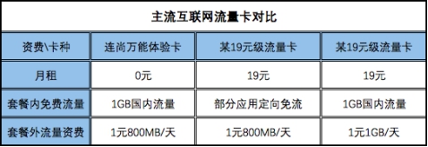 相较于市面上比较常见的19元级流量卡,连尚万能体验卡的价格优势非常明显。用户不仅省去了每月19元的月租费,还可免费使用每月1GB的国内通用流量,比很多定向免流卡适用范围更广。