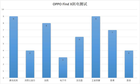 另外,小编也模拟日常使用场景,进行了更为全面的测试,测试分为视频、音乐、拍照、电子书、上网浏览 、游戏、微博、微信八类,每一类的测试时间均为半小时。数据显示,在经过连续四个小时的高强度使用之后,Find X共计耗费50%的电量,也就是说连续不间断的使用Find X可以坚持8小时,这么看的话,日常使用Find X坚持一整天绝对没有问题。