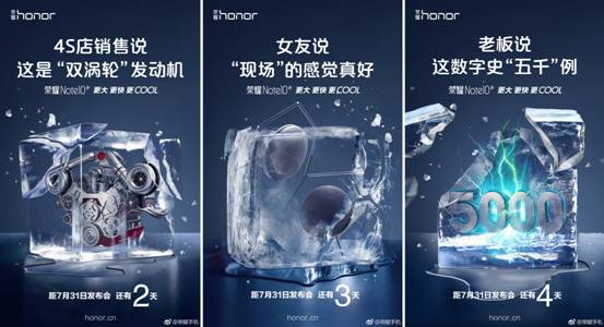 而且从目前荣耀Note10的三张倒计时海报设计来看,都采用了“冰块炸裂”的元素,不仅非常冷cool,可能在续航、音效等方面的强劲实力也非同凡响。此外,荣耀总裁赵明还曾透漏出荣耀Note10将在AI技术方面有革命性的突破,还有坊间热议的双系统、触控笔等都使得这台大屏旗舰机非常值得期待,不过具体还要等到发布会才见分晓。
